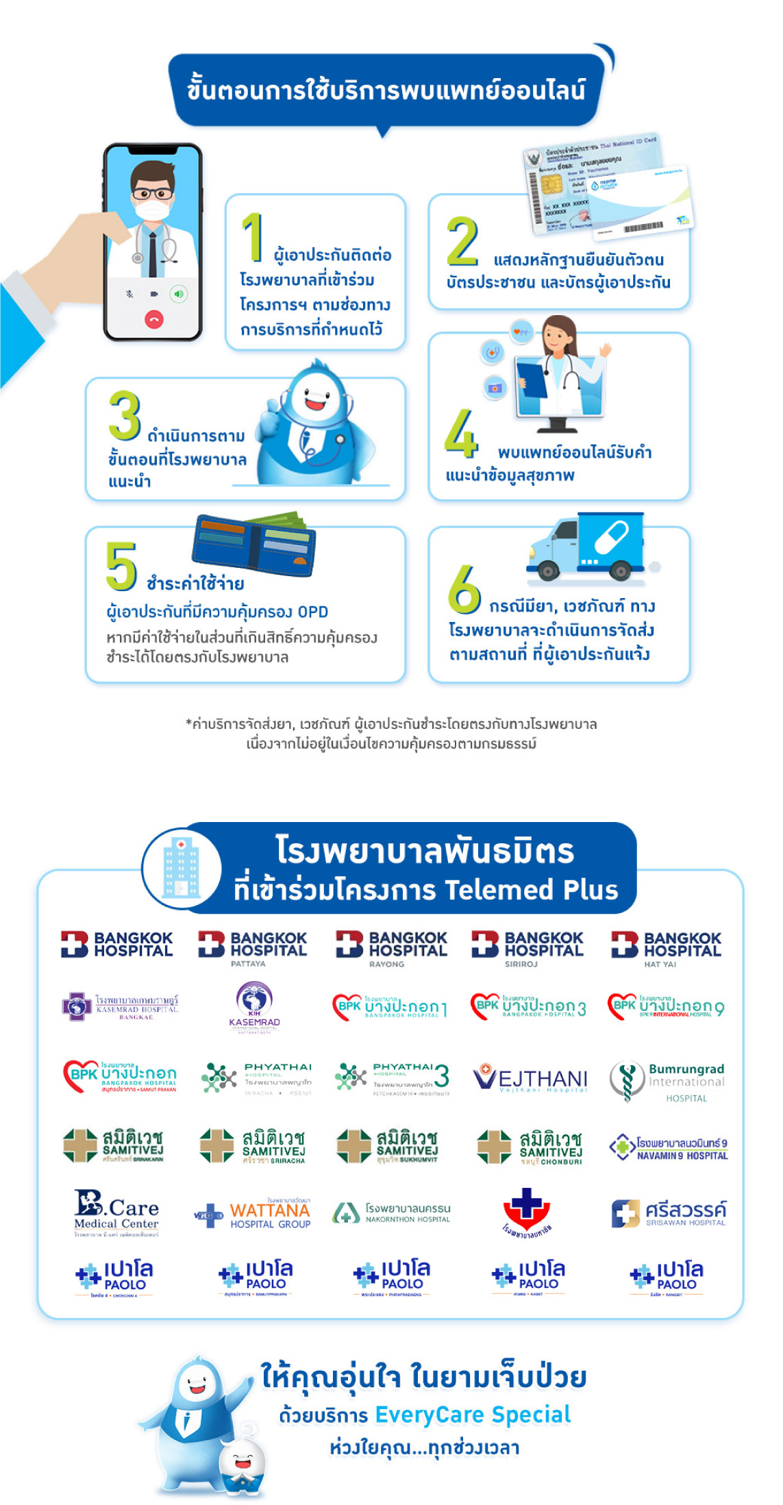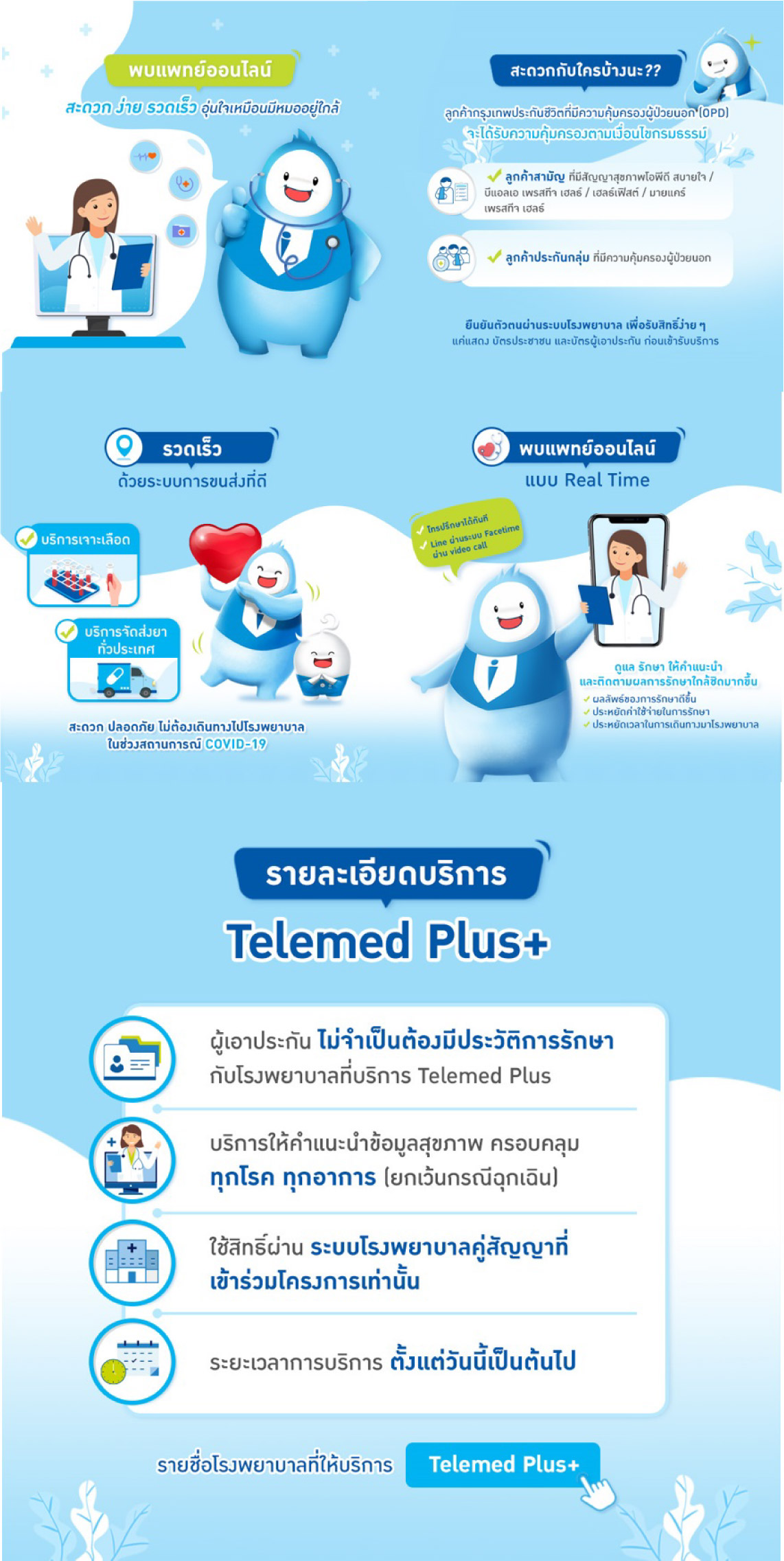 บริการเทเลเมดิซีน หรือ Telemed Plus จากกรุงเทพประกันชีวิต เป็นบริการปรึกษาแพทย์ผ่านช่องทางออนไลน์ ช่วยอำนวยความสะดวกแก่ผู้เอาประกันภัยของเราด้วยการร่วมกับโรงพยาบาลในเครือข่ายให้ใช้สิทธิ์ผู้ป่วยนอกได้ โดยถ้ามีอาการเจ็บป่วยทั่วไป เพื่อความปลอดภัยของผู้เอาประกันภัย โดยไม่ต้องเดินทางไปโรงพยาบาล สามารถปรึกษาแพทย์และรับยาผ่านช่องทางนี้ได้ พร้อมทั้งสามารถใช้สิทธิ์เคลมประกันผู้ป่วยนอกได้โดยไม่ต้องสำรองจ่าย ตรวจสอบรายชื่อโรงพยาบาลที่ร่วมบริการ Telemed Plus ได้จากเว็บไซต์ www.bangkoklife.com/HappyLifeClub/th หรือ ลิงค์เข้าดูรายละเอียดตรงที่ http://bit.ly/Telemed-Plus