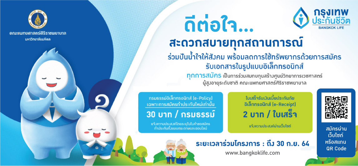 ม.ล.จิรเศรษฐ ศุขสวัสดิ์ กรรมการผู้จัดการใหญ่และประธานเจ้าหน้าที่บริหาร บริษัท กรุงเทพประกันชีวิต จำกัด (มหาชน) กล่าวว่า “กรุงเทพประกันชีวิต ได้คำนึงถึงปัญหาสิ่งแวดล้อม รวมถึงการลดการใช้กระดาษ ลดปริมาณขยะที่เพิ่มขึ้นทุกวันและลดความเสี่ยงของการแพร่กระจายจากเชื้อไวรัสโควิด-19 จึงมีนโยบายส่งเสริมให้ลูกค้าผู้เอาประกัน หันมาใช้บริการรับเอกสารในรูปแบบอิเล็กทรอนิกส์ นอกจากนี้ลูกค้ายังร่วมเป็นส่วนหนึ่งในการปันน้ำใจสู่สังคม เพียงลูกค้าแจ้งความประสงค์โดยระบุใบคำขอรับกรมธรรม์ประกันชีวิตอิเล็กทรอนิกส์ (e-Policy) 1 กรมธรรม์ เท่ากับได้ร่วมสมทบทุน 30 บาท และใบเสร็จรับเงินเบี้ยประกันภัยรูปแบบอิเล็กทรอนิกส์ (e-Receipt) 1 ฉบับ เท่ากับได้ร่วมสมทบทุน 2 บาท โดยสมัครผ่านเว็บไซต์ www.bangkoklife.com หรือสแกนคิวอาร์โค้ด โดยมีระยะเวลากำหนดตั้งแต่วันนี้ถึง 30 กันยายน 2564 เพื่อร่วมสมทบทุนสร้างศูนย์วิทยาการเวชศาสตร์ผู้สูงอายุระดับชาติ คณะแพทยศาสตร์ศิริราชพยาบาลไปพร้อม ๆ กันด้วย”