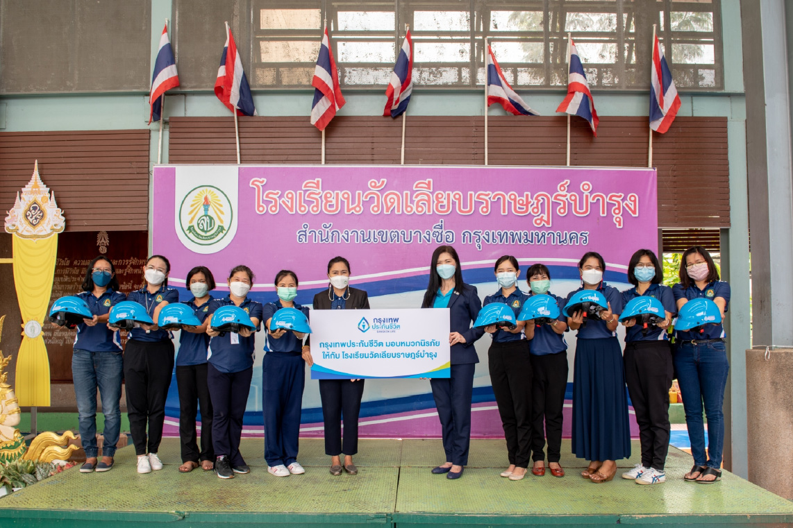กรุงเทพประกันชีวิต นำโดย นางอรนุช สำราญฤทธิ์(ที่ 6 จากขวา) ผู้ช่วยผู้จัดการใหญ่สายประกันชีวิตและนางสาวขวัญชนก แดงนวน(ที่ 6 จากซ้าย) ผู้อำนวยการสถานศึกษาโรงเรียนวัดเลียบราษฎร์บำรุง เป็นตัวแทนมอบหมวกนิรภัย ให้แก่คณะครู นักเรียน เยาวชนและชุมชนโดยรอบ โรงเรียนวัดเลียบราษฎร์บำรุง สำนักงานเขตบางซื่อ เพื่อช่วยลดความเสี่ยงและส่งเสริมความปลอดภัยในชีวิตประจำวัน อีกทั้งกิจกรรมดังกล่าวยังเป็นส่วนหนึ่งของโครงการรณรงค์ความปลอดภัยทางถนนซึ่งจัดขึ้นโดยสำนักงานคณะกรรมการกำกับและส่งเสริมการประกอบธุรกิจประกันภัย (คปภ.) โดยกรุงเทพประกันชีวิต มีความมุ่งมั่นในการสนับสนุนให้คนไทยมีชีวิตที่มั่นคง พร้อมสนับสนุนการพัฒนาคุณภาพชีวิตในหลากหลายมิติ ตลอดจนมอบความรู้สึกดีดี ผ่านโครงการเพื่อสังคม ชุมชนและสิ่งแวดล้อมอย่างต่อเนื่องเพื่อความยั่งยืน