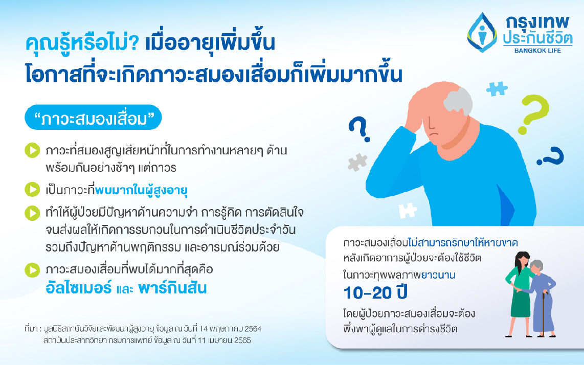 โดย 5 สาเหตุหลักของความกังวลในกลุ่มผู้สูงอายุคือ 1.ไม่สามารถทำสิ่งต่างๆ ที่เคยทำได้ 2.เจ็บป่วย 3.ไม่สามารถเคลื่อนไหวได้ 4.มีเงินไม่พอต่อการดำรงชีวิต และ 5.เสียความทรงจำ โดยโรคในผู้สูงอายุส่วนใหญ่ที่พบ ไม่เพียงแต่โรคร้ายแรงอย่างโรคหัวใจ โรคหลอดเลือดสมอง หรือโรคมะเร็งเท่านั้น แต่ความเสี่ยงของผู้สูงอายุที่พบมากในปัจจุบันคือ "ภาวะสมองเสื่อม" เช่น โรคภาวะถดถอยทางสมองระยะเริ่มต้น, อัลไซเมอร์, พาร์กินสัน โดยมีผู้สูงอายุในประเทศไทยมีภาวะสมองเสื่อมเฉลี่ยร้อยละ 2 ถึง 10 ซึ่งเมื่ออายุเพิ่มขึ้นโอกาสที่จะเกิดภาวะสมองเสื่อมก็มากขึ้น ทั้งนี้ค่าใช้จ่ายต่างๆ ที่เกิดขึ้นเมื่อผู้ป่วยมีภาวะสมองเสื่อมจะไม่ใช่ค่าใช้จ่ายครั้งเดียว แต่เป็นค่าใช้จ่ายที่จะเกิดขึ้นอย่างต่อเนื่องตลอดชีวิตของผู้ป่วย นอกจากค่าใช้จ่ายด้านการรักษาพยาบาลแล้วยังมีค่าใช้จ่ายในการดำรงชีวิตที่เพิ่มขึ้นด้วย อาทิ ค่าดูแลผู้สูงอายุ ไม่ว่าจะเป็น Day Care หรือ Nursing Care ในกรณีที่คนในครอบครัวไม่สะดวกในการที่ต้องดูแลผู้สูงอายุ