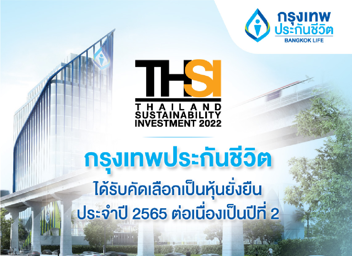 บริษัท กรุงเทพประกันชีวิต จำกัด (มหาชน) ได้รับการคัดเลือกจากตลาดหลักทรัพย์แห่งประเทศไทยเป็นหนึ่งใน 170 บริษัทที่มีรายชื่ออยู่ในหุ้นยั่งยืน (Thailand Sustainability Investment หรือ THSI) ประจำปี 2565 ภายใต้กลุ่มธุรกิจการเงิน ตอกย้ำถึงการให้ความสำคัญในการดำเนินธุรกิจอย่างยั่งยืน มีความมุ่งมั่นในการดูแลผู้มีส่วนได้เสีย มีความรับผิดชอบต่อสังคม ชุมชน และสิ่งแวดล้อม พร้อมรับมือกับความเปลี่ยนแปลงและสร้างโอกาสในการแข่งขันผ่านนวัตกรรมทางธุรกิจตามหลักบรรษัทภิบาล สู่การขับเคลื่อนองค์กรให้เติบโตอย่างยั่งยืน