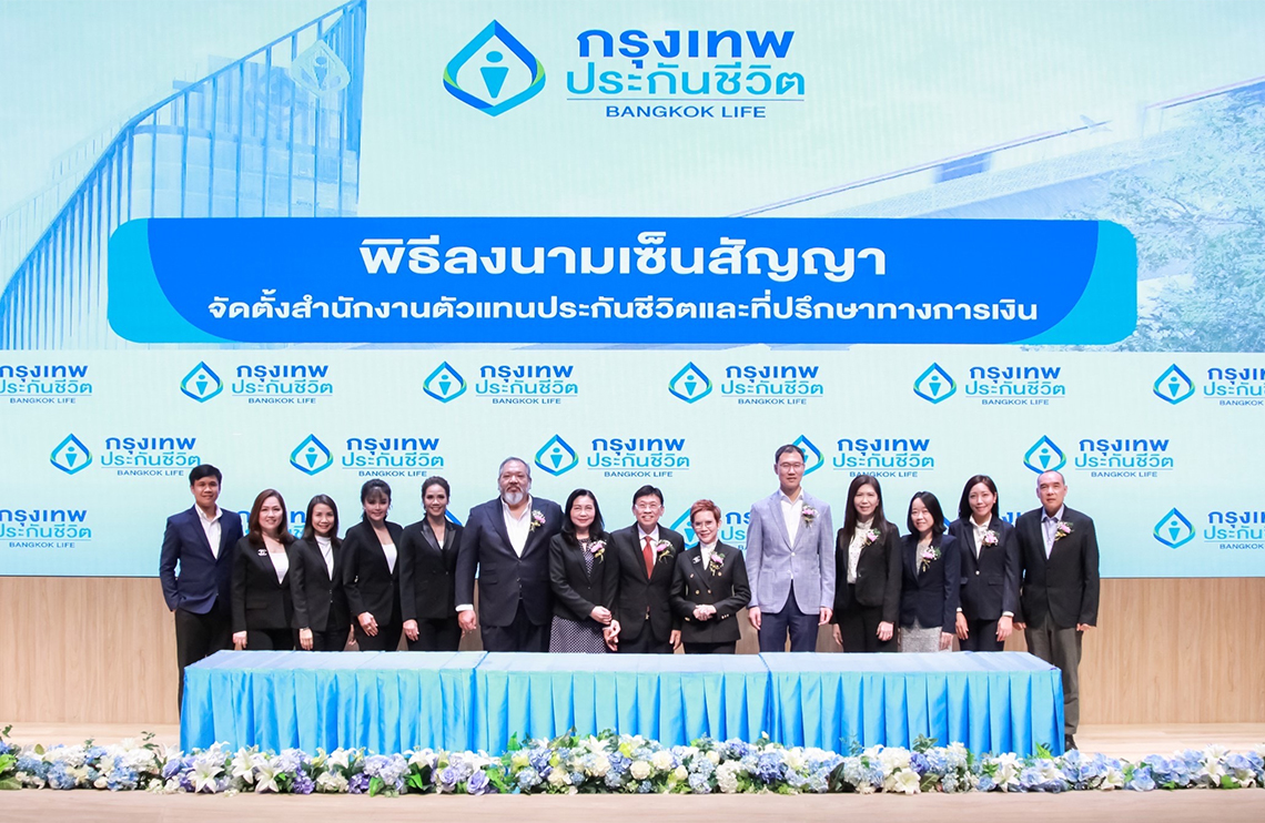 บริษัท กรุงเทพประกันชีวิต จำกัด (มหาชน) นำโดย นายโชน โสภณพนิช (ที่ 5 จากขวา) กรรมการผู้จัดการใหญ่และประธานเจ้าหน้าที่บริหาร และ นายอนุชา ภิงคารวัฒน์ (ที่ 6 จากซ้าย) ผู้ช่วยผู้จัดการใหญ่ สายงานตัวแทนและที่ปรึกษาทางการเงิน จัดพิธีลงนามเซ็นสัญญาจัดตั้งสำนักงานตัวแทนประกันชีวิต 2 แห่งใหม่ โดยมีคณะผู้บริหาร นางสาวจารุวรรณ ลิ้มคุณธรรมโม (ที่ 3 จากขวา) ผู้ช่วยผู้จัดการใหญ่ สายบัญชีและการเงิน นางอรนุช สำราญฤทธิ์ (ที่ 4 จากขวา) ผู้ช่วยผู้จัดการใหญ่ สายประกันชีวิต และนายปรัชญ์ สิงหเสนี (ขวาสุด) ผู้บริหารฝ่ายพัฒนาธุรกิจตัวแทนและที่ปรึกษาทางการเงิน พร้อมคณะผู้บริหารระดับสูงและทีมงานฝ่ายขาย ร่วมแสดงความยินดีและเป็นสักขีพยาน