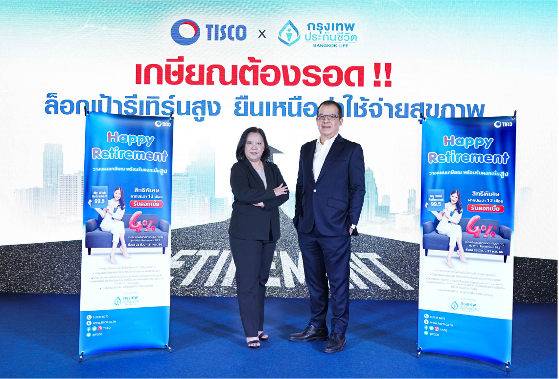 หลังจากธนาคารทิสโก้ ประกาศความร่วมมือกับ บริษัท กรุงเทพประกันชีวิต จำกัด (มหาชน) เพื่อสร้างความมั่นคงและปกป้องความมั่งคั่งให้ชีวิตคนไทยอย่างครบวงจร ครอบคลุมทั้งการเสริมสร้างความรู้ในเรื่องวางแผนการเงินเพื่อการเกษียณ การคิดค้นผลิตภัณฑ์รูปแบบใหม่เพื่อการเกษียณที่มีคุณภาพ ร่วมกันจัดกิจกรรมส่งเสริมการตลาด เป็นต้น