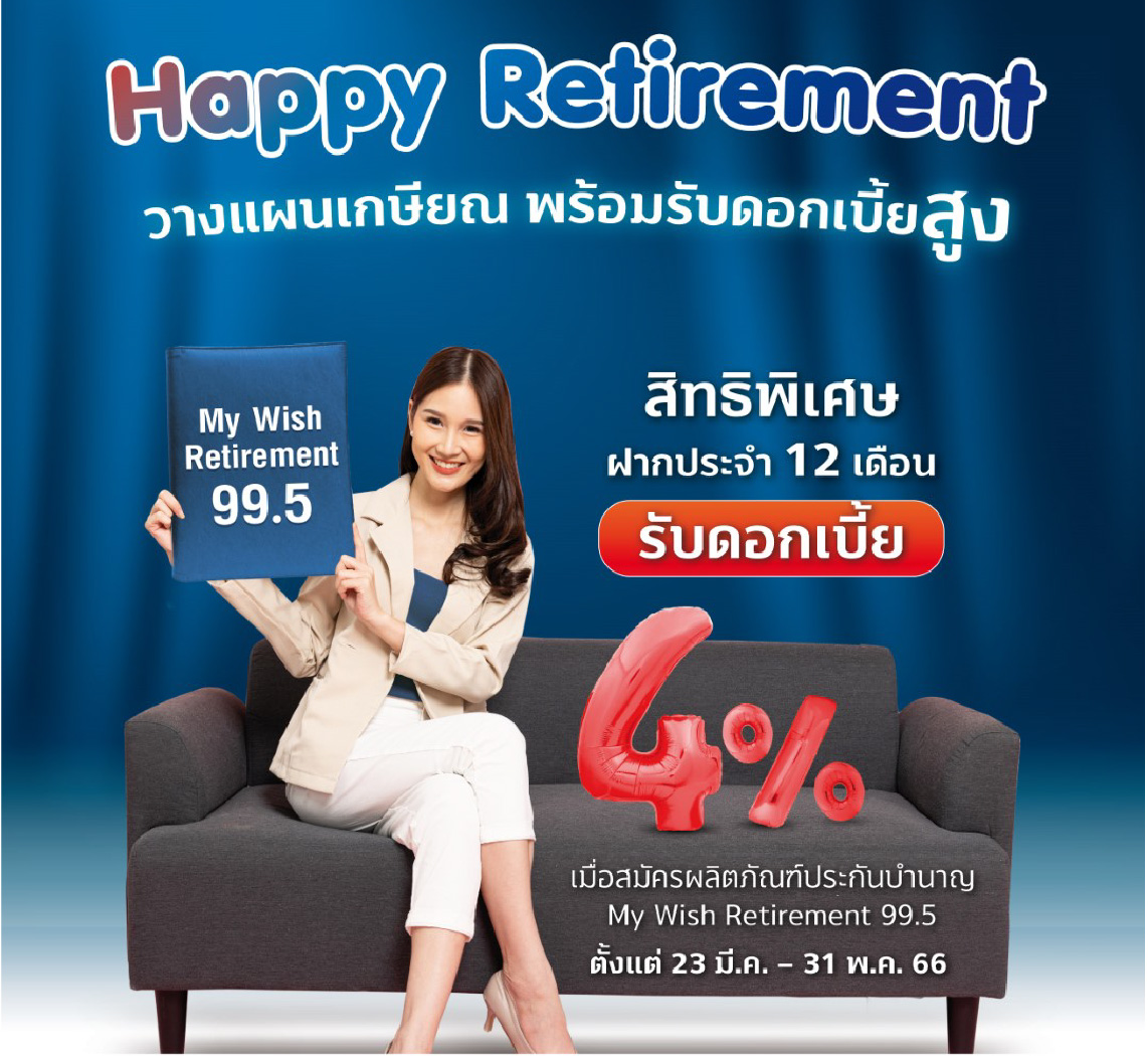 พร้อมเปิดตัวบัญชีเงินฝากประจำ 12 เดือน “Happy Retirement” อัตราดอกเบี้ย 4% ต่อปี ซึ่งเป็นผลิตภัณฑ์ทางการเงินมอบสิทธิพิเศษให้กับลูกค้าที่ซื้อผลิตภัณฑ์ประกันบำนาญ My Wish Retirement 99.5 ในระหว่างวันที่ 23 มีนาคม - 31 พฤษภาคม 2566 โดยสามารถฝากเงินด้วยจำนวนเงินสูงสุดเท่ากับค่าเบี้ยประกันที่ชำระปีแรก ทั้งนี้ เงื่อนไขเป็นไปตามที่ธนาคารกำหนด