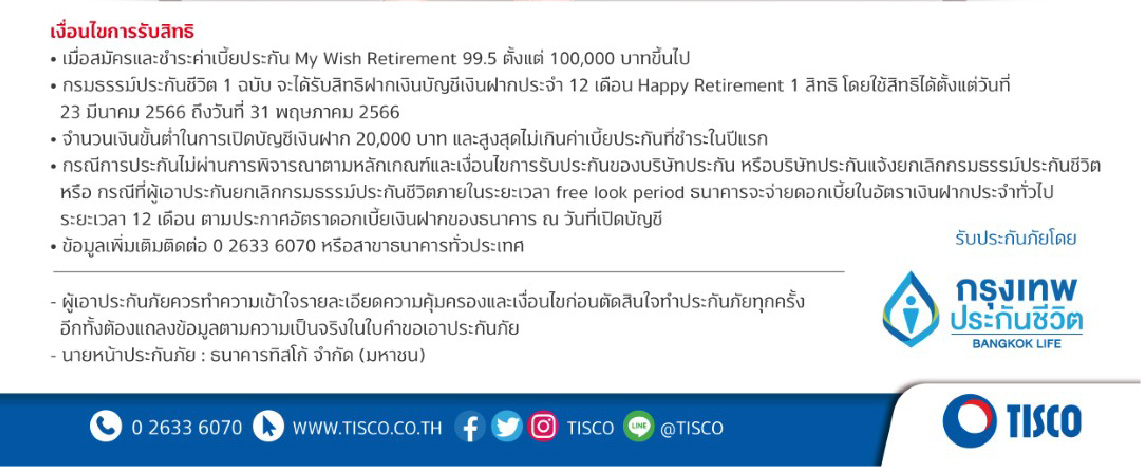 สำหรับลูกค้าที่สนใจประกันบำนาญ ‘My Wish Retirement’ คลิก https://link.tisco.co.th/2gzJsF หรือ สอบถามเพิ่มเติมหรือ สอบถามประกันภัยประเภทอื่นๆ ได้ที่ Contact Center 0-2633-6070 หรือ เว็บไซต์ www.tisco.co.th