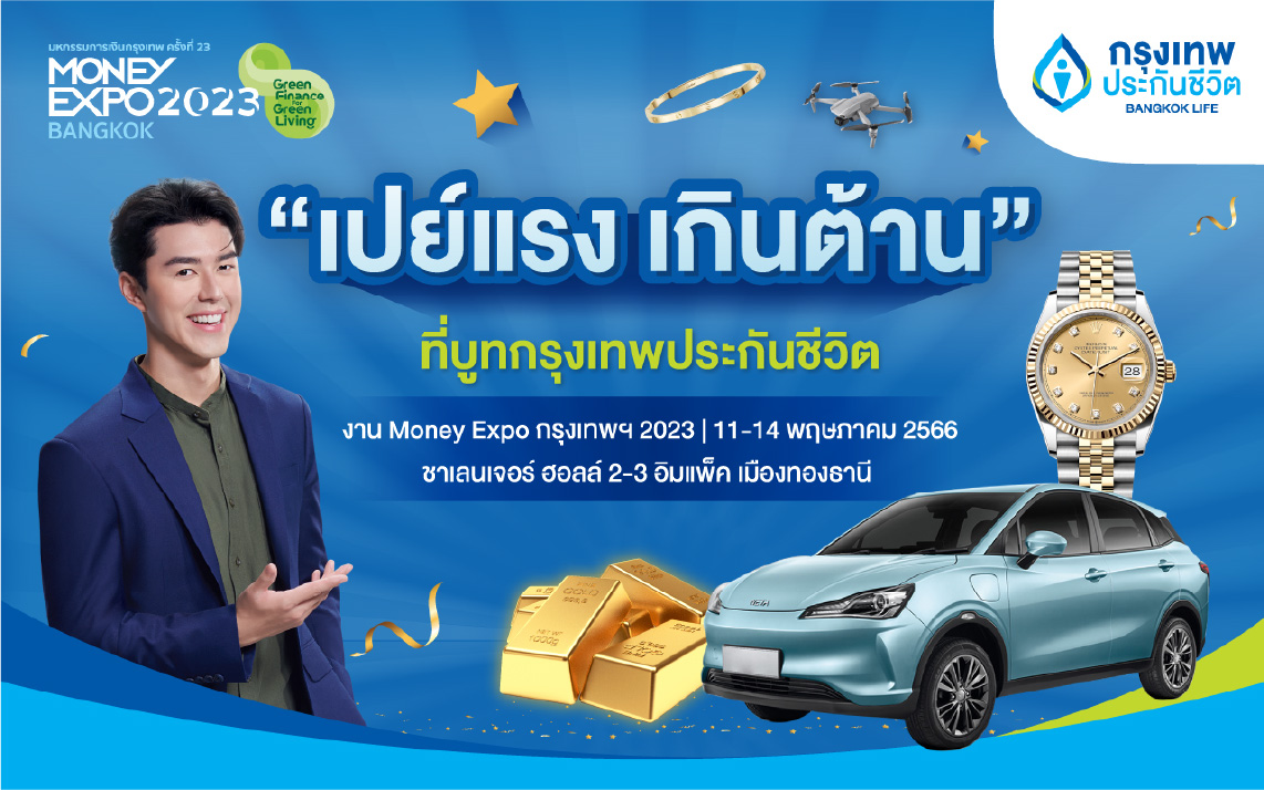 กรุงเทพประกันชีวิต ร่วมงาน “มหกรรมการเงินกรุงเทพ ครั้งที่ 23 หรือ Money Expo Bangkok 2023” ระหว่างวันที่ 11 - 14 พฤษภาคม 2566 ณ ชาเลนเจอร์ 2-3 อิมแพคเมืองทองธานี ยกขบวนผลิตภัณฑ์ประกันชีวิตที่หลากหลายและตอบโจทย์ ภายใต้แนวคิด “Happy Health, Happy Wealth ความสุขกับสุขภาพที่ดีและการเงินที่มั่งคั่ง” ที่มาพร้อมโปรสุดปัง “เปย์แรง เกินต้าน” เลือกรับไม่ต้องลุ้นกับรางวัลสูงสุด รถยนต์ไฟฟ้า นาฬิกา Rolex ทองคำ 15 บาท พบแบรนด์แอมบาสเดอร์สุดหล่อ “นาย ณภัทร” พร้อมกิจกรรมและของรางวัลมากมายตลอดงาน