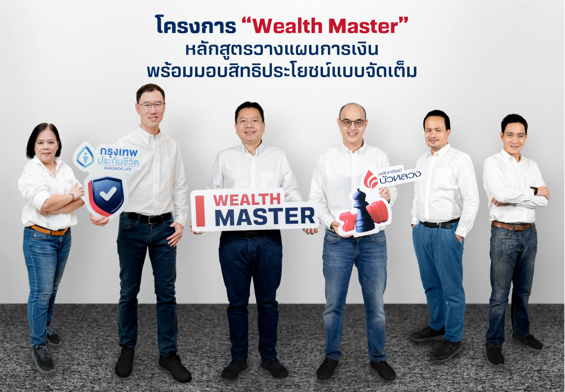 กรุงเทพประกันชีวิต นำโดย นายโชน โสภณพนิช (ที่ 2 จากซ้าย) กรรมการผู้จัดการใหญ่และประธานเจ้าหน้าที่บริหาร และ นางลัดดาวัลย์ สิทธิวรนันท์ ผู้ช่วยผู้จัดการใหญ่ สายช่องทางสถาบันการเงินและพันธมิตรทางธุรกิจ จับมือ หลักทรัพย์บัวหลวง นำโดย นายพิเชษฐ สิทธิอำนวย (ที่ 3 จากซ้าย) กรรมการผู้อำนวยการ พร้อมด้วย นายบรรณรงค์ พิชญากร (ที่ 3 จากขวา ) กรรมการผู้จัดการอาวุโส กิจการค้าหลักทรัพย์ เปิดตัวโครงการ “Wealth Master” หลักสูตรวางแผนทางการเงินสุดเข้มข้น สำหรับสมาชิกแบบรายปี พร้อมสิทธิประโยชน์แบบจัดเต็มตลอดปี ประเดิมมอบหน่วยลงทุน มูลค่า 300 บาท เพื่อเป็นจุดเริ่มต้นสำหรับแผนการออมในระยะยาวผ่านกองทุนรวม