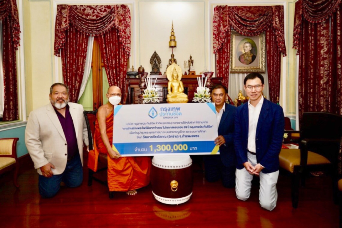 บริษัท กรุงเทพประกันชีวิต จำกัด (มหาชน) นำโดย นายโชน โสภณพนิช (ที่ 1 จากขวา) กรรมการผู้จัดการใหญ่และประธานเจ้าหน้าที่บริหาร บริษัท กรุงเทพประกันชีวิต จำกัด (มหาชน) หม่อมหลวงจิรเศรษฐ ศุขสวัสดิ์ (ที่ 2 จากขวา) ที่ปรึกษาประธานกรรมการ พร้อมด้วย นายอนุชา ภิงคารวัฒน์ (ที่ 1 จากซ้าย) ผู้ช่วยผู้จัดการใหญ่สายงานตัวแทนและที่ปรึกษาทางการเงิน ร่วมถวายรายได้หลังหักค่าใช้จ่ายจากการจัดสร้าง พระไพรีพินาศ พระพุทธรูปบูชา จำนวน 999 องค์ และพระกริ่ง 2,999 องค์ เนื่องในโอกาสครบรอบ 69 ปีของการก่อตั้งบริษัท รวม 1,300,000 บาท แด่ พระครูวัชระวรธรรม (จตุรงค์ ติสโร) เจ้าอาวาสวัดนาควัชรโสภณ (วัดช้าง) เพื่อนำไปสนับสนุนการศึกษาของโรงเรียนพระปริยัติธรรม ส่งเสริมการสร้างศาสนทายาทที่ดี มีความรู้ความเข้าใจในหลักธรรมทางพระพุทธศาสนา และสืบต่อให้เจริญสถาพรต่อไป