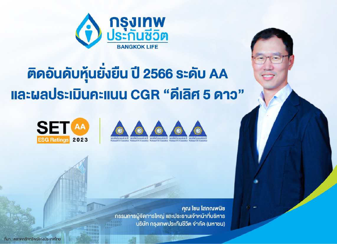 บริษัท กรุงเทพประกันชีวิต จำกัด (มหาชน) ได้รับการคัดเลือกให้อยู่ในรายชื่อหุ้นยั่งยืน “SET ESG Ratings” ต่อเนื่องเป็นปีที่ 3 โดยในปีนี้ได้รับผลการประเมินในระดับ AA ประจำปี 2566 จากตลาดหลักทรัพย์แห่งประเทศไทย โดยเป็น 1 ใน 193 บริษัทจดทะเบียนที่ได้รับการประกาศผลประเมินหุ้นยั่งยืน SET ESG Ratings สะท้อนถึงความมั่นคงในการดำเนินธุรกิจอย่างยั่งยืนของกรุงเทพประกันชีวิต ภายใต้วิสัยทัศน์และพันธกิจในการสร้างความมั่นคงทางการเงินให้กับประชาชนทุกกลุ่ม ด้วยการปกป้องคุณค่าชีวิต การให้คำแนะนำด้านการวางแผนการเงิน และบริการที่ประทับใจผ่านตัวแทน คู่ค้า และพนักงาน ที่มีความจริงใจและมีความรู้ระดับแนวหน้าของประเทศ ควบคู่ไปกับการให้ความสำคัญกับการดูแลผู้มีส่วนได้เสีย มีความรับผิดชอบต่อสังคม ชุมชน และสิ่งแวดล้อม รวมถึง การบริหารงานตามหลักบรรษัทภิบาลที่ดี (Environmental, Social and Governance: ESG) พร้อมรับมือกับความเปลี่ยนแปลง และสร้างโอกาสในการแข่งขันผ่านนวัตกรรมทางธุรกิจ สู่การขับเคลื่อนองค์กรให้เติบโตอย่างยั่งยืน