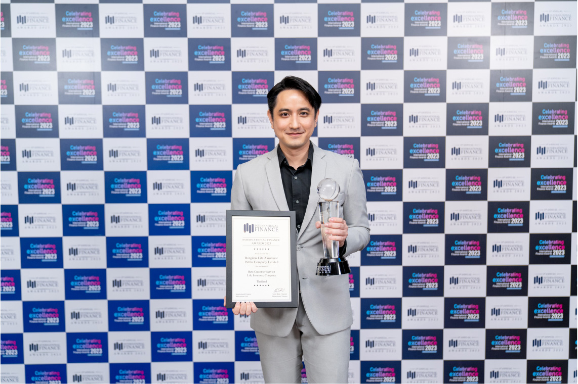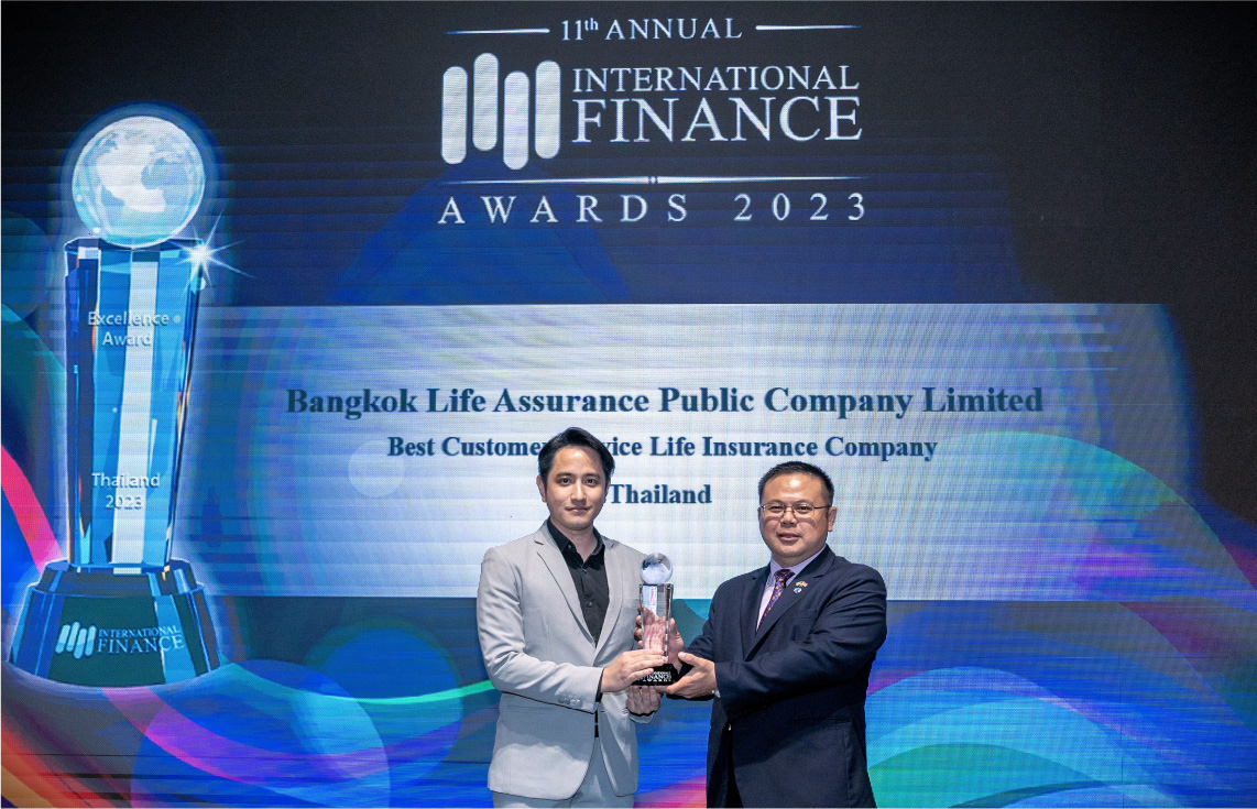นายชัยพล อินทุประภา (ซ้าย) ผู้อำนวยการอาวุโส สายกลยุทธ์และวางแผนธุรกิจองค์กร บริษัท กรุงเทพประกันชีวิต จำกัด (มหาชน) เป็นผู้แทนรับมอบรางวัล Best Customer Service Life Insurance Company ในฐานะบริษัทประกันชีวิตที่มีการบริการลูกค้ายอดเยี่ยมจากเวที International Finance Awards 2023 จัดโดยนิตยสารด้านธุรกิจและการเงินชั้นนำระดับโลกจากประเทศอังกฤษ