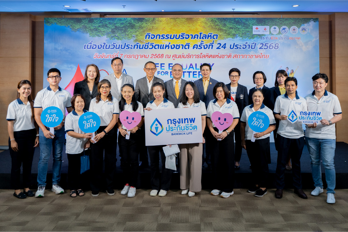 บริษัท กรุงเทพประกันชีวิต จำกัด (มหาชน) นำโดย นางสาวจารุวรรณ ลิ้มคุณธรรมโม ผู้ช่วยผู้จัดการใหญ่ สายบัญชีและการเงิน (ที่ 5 จากขวาล่าง) พร้อมด้วยพนักงานจิตอาสา สานต่อพันธกิจองค์กร “ใส่ใจสังคม” เข้าร่วมกิจกรรมบริจาคโลหิตเพื่อผู้ป่วยทั่วประเทศ เนื่องในวันประกันชีวิตแห่งชาติครั้งที่ 24 ประจำปี 2568 จัดโดยสำนักงานคปภ สมาคมประกันชีวิตไทย ที่จัดขึ้นเพื่อส่งเสริมการมีส่วนร่วมของภาคธุรกิจประกันชีวิตในการช่วยเหลือสังคมผ่านการบริจาคโลหิต ซึ่งเป็นโครงการที่กรุงเทพประกันชีวิตให้ความสำคัญและร่วมกิจกรรมเพื่อตอบแทนสังคมมาอย่างต่อเนื่องเป็นประจำทุกปี ณ ศูนย์บริการโลหิตแห่งชาติ สภากาชาดไทย เมื่อเร็ว ๆ นี้