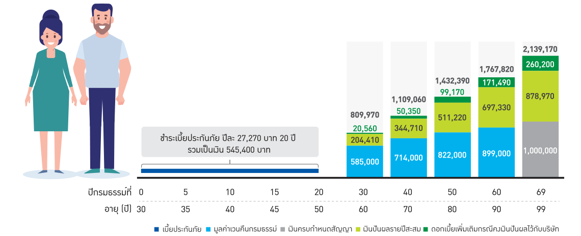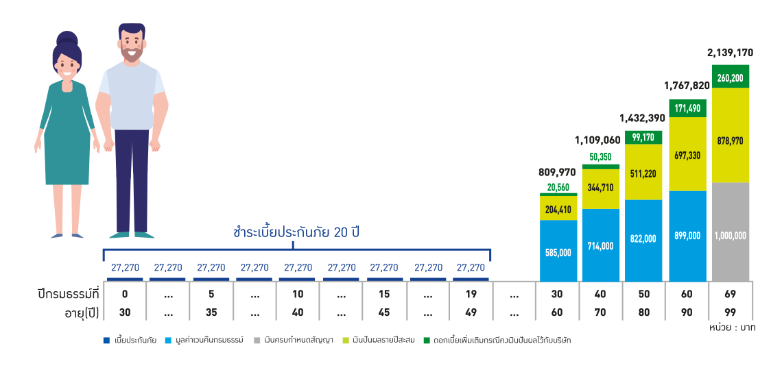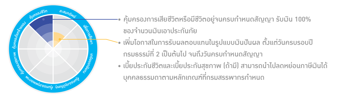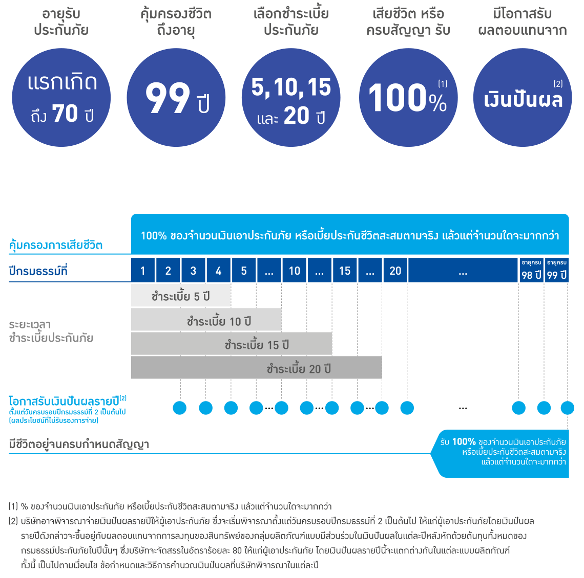 - เงินปันผลรายปี และมูลค่าเวนคืนกรมธรรม์ เป็นมูลค่าที่คำนวณ ณ วันครบรอบปีกรมธรรม์