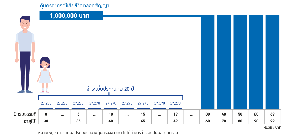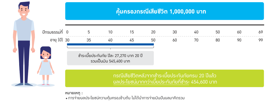 - กรณีเสียชีวิต จะได้รับผลประโยชน์ตามความคุ้มครองชีวิตในตารางข้างต้น หรือเบี้ยประกันชีวิตสะสมตามจริง แล้วแต่จำนวนใดจะมากกว่า