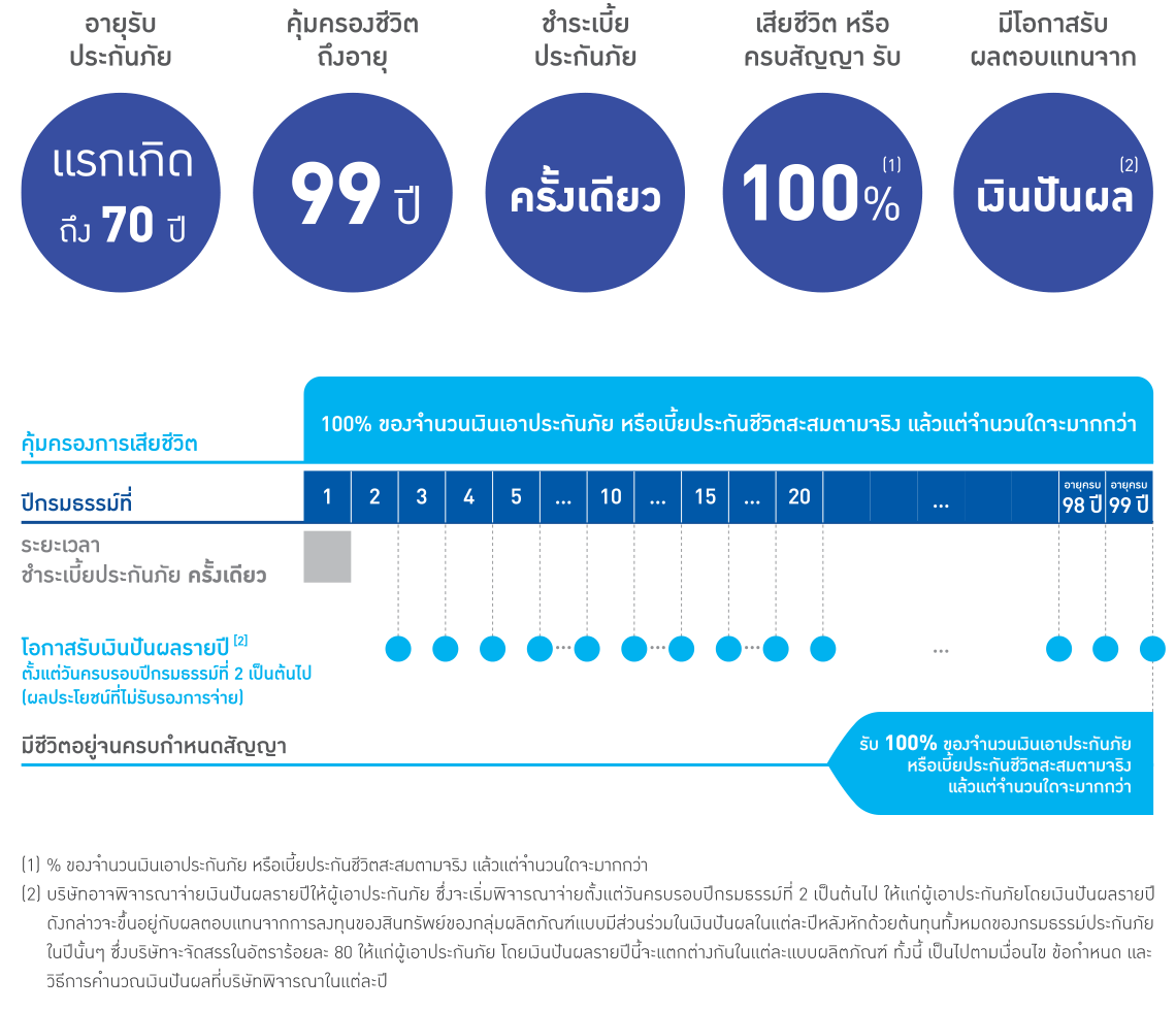 [2] บริษัทอาจพิจารณาจ่ายเงินปันผลรายปีให้ผู้เอาประกันภัย ซึ่งจะเริ่มพิจารณาตั้งแต่วันครบรอบปีกรมธรรม์ที่ 2 เป็นต้นไปให้แก่ผู้เอาประกันภัย โดยเงินปันผลรายปีดังกล่าวจะขึ้นอยู่กับผลตอบแทนจากการลงทุนของสินทรัพย์ของกลุ่มผลิตภัณฑ์แบบมีส่วนร่วมในเงินปันผลในแต่ละปีหลังหักด้วยต้นทุนทั้งหมดของกรมธรรม์ประกันภัยปีนั้น ๆ ซึ่งบริษัทจะจัดสรรในอัตราร้อยละ 80 ให้แก่ผู้เอาประกันภัย โดยเงินปันผลรายปีนี้จะแตกต่างกันในแต่ละแบบผลิตภัณฑ์ ทั้งนี้ เป็นไปตามเงื่อนไข ข้อกำหนดและวิธีการคำนวณเงินปันผลที่บริษัทพิจารณาในแต่ละปี