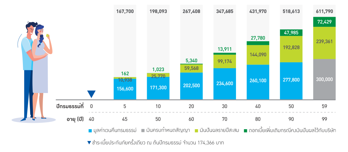 เงินปันผลรายปีสะสมข้างต้นเป็นกรณีอ้างอิงสมมติฐานที่บริษัทได้รับผลตอบแทนจากการลงทุนของสินทรัพย์ของกลุ่มผลิตภัณฑ์แบบมีส่วนร่วมในเงินปันผลอยู่ที่ร้อยละ 5 ต่อปี และผู้เอาประกันภัยคงเงินปันผลรายปีไว้กับบริษัททุกปีกรมธรรม์ ตั้งแต่วันครบรอบปีกรมธรรม์ที่ 2 จนครบกำหนดสัญญา โดยบริษัทคำนวณอัตราดอกเบี้ยทบต้นร้อยละ 1.0 ต่อปี อย่างไรก็ตามอัตราดอกเบี้ยทบต้นดังกล่าวเป็นเพียงตัวอย่างการคำนวณเท่านั้น ไม่ใช่ อัตราดอกเบี้ยที่มริษัทรับรอง เนื่องจากอาจมีอัตราต่ำกว่าหรือสูงกว่าตัวอย่างนี้ก็ได้