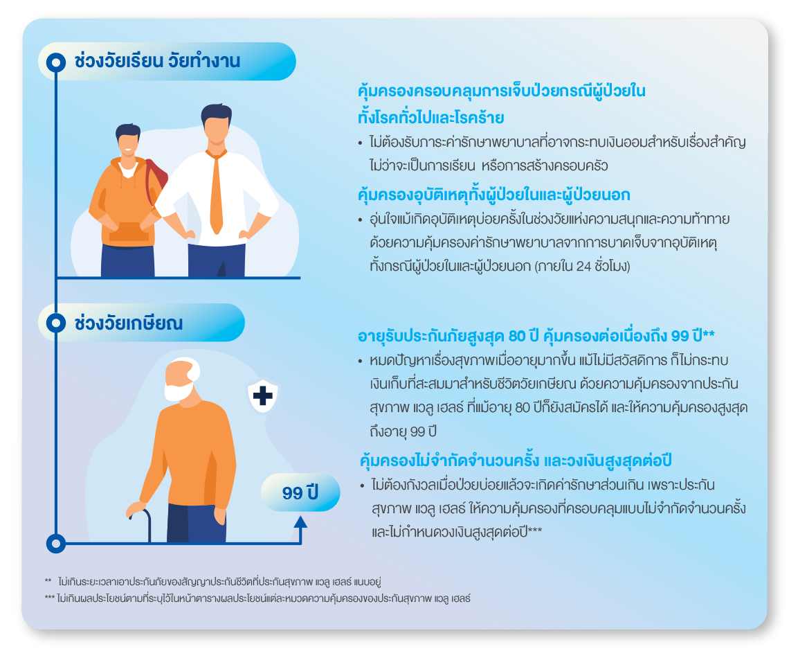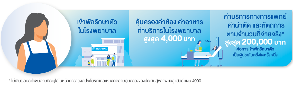 | หมวดที่ 2 | ค่าบริการทางการแพทย์เพื่อการตรวจวินิจฉัยหรือบำบัดรักษา ค่าบริการโลหิตและส่วนประกอบของโลหิต ค่าบริการทางการพยาบาล ค่ายา ค่าสารอาหารทางหลอดเลือด และค่าเวชภัณฑ์ ต่อการเข้าพักรักษาตัวเป็นผู้ป่วยในครั้งใดครั้งหนึ่ง | เมื่อรวมผลประโยชน์หมวดที่ 2 ต้องไม่เกิน 25,000 | เมื่อรวมผลประโยชน์หมวดที่ 2 ต้องไม่เกิน 30,000 | เมื่อรวมผลประโยชน์หมวดที่ 2 และหมวดย่อยที่ 4.1 – 4.4 ต้องไม่เกิน 200,000 | เมื่อรวมผลประโยชน์หมวดที่ 2 และหมวดย่อยที่ 4.1 – 4.4 ต้องไม่เกิน 400,000 |