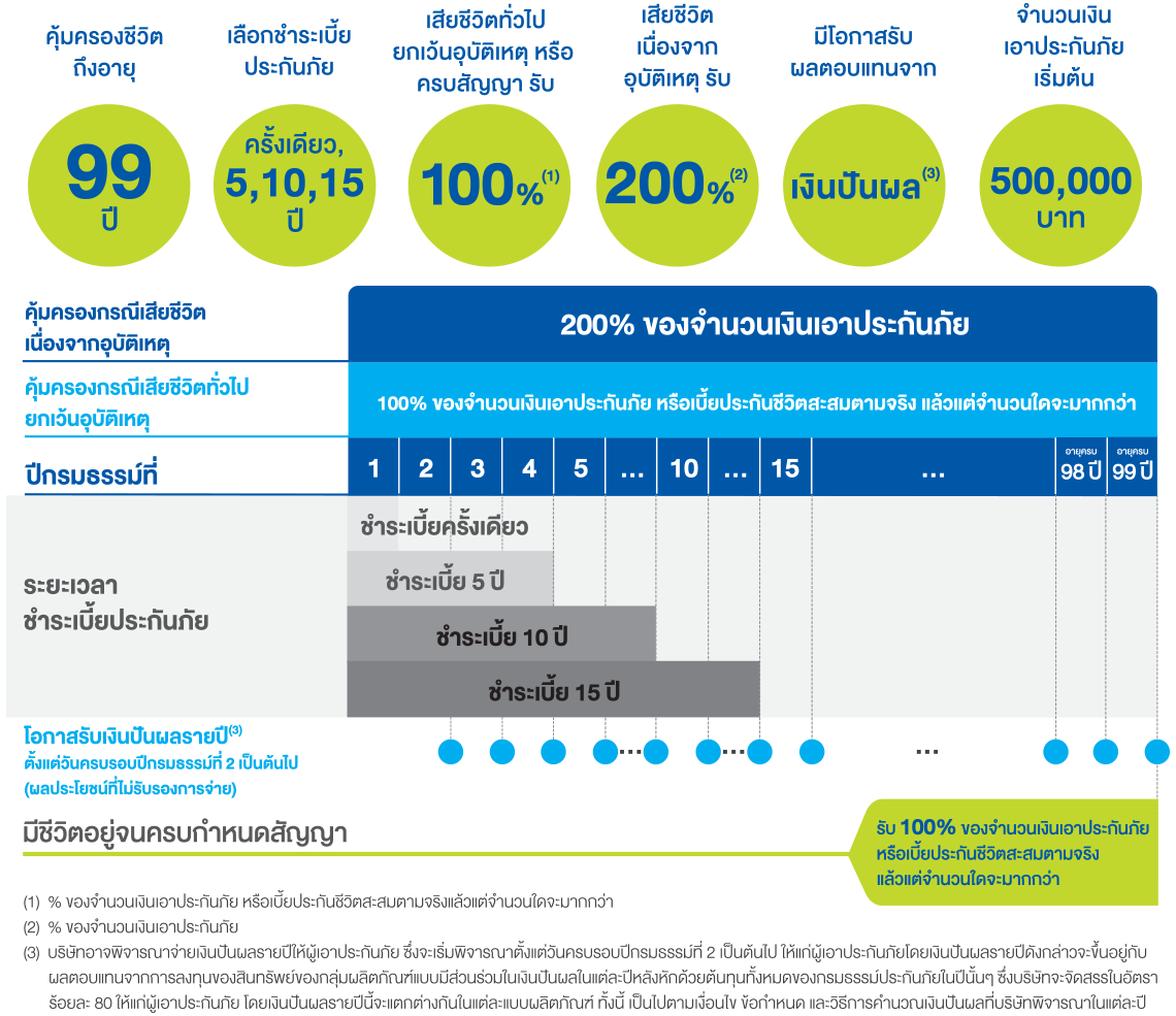 | อายุครบ 99 ปี | 292,650 | 1,885 | 5,900 | 9,910 | 100% | 500,000 | 200% | 1,000,000 | 500,000 | ||