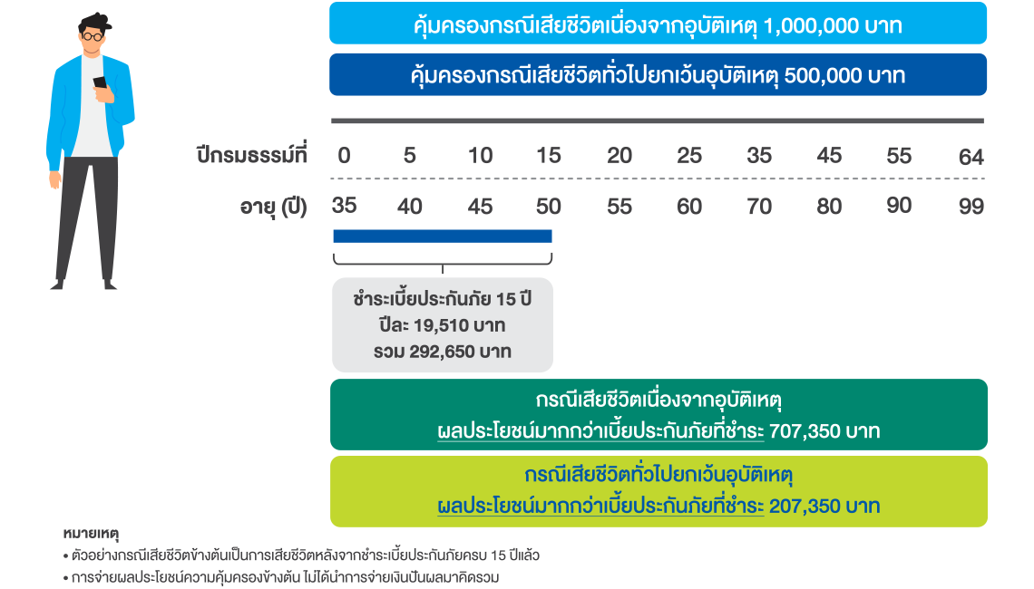 คุณผู้ชาย อายุ 35 ปี สุขภาพแข็งแรง สมัครทำประกันชีวิตแบบแฮปปี้ โฮลไลฟ์ (มีเงินปันผล) ระยะเวลาเอาประกันภัย ถึงอายุ 99 ปี ระยะเวลาชำระเบี้ยประกันภัย 15 ปี จำนวนเงินเอาประกันภัย 500,000 บาท ชำระเบี้ยประกันภัยรายปี ปีละ 19,510 บาท และมีอัตราภาษีเงินได้บุคคลธรรมดาร้อยละ 10 ตลอดอายุสัญญา