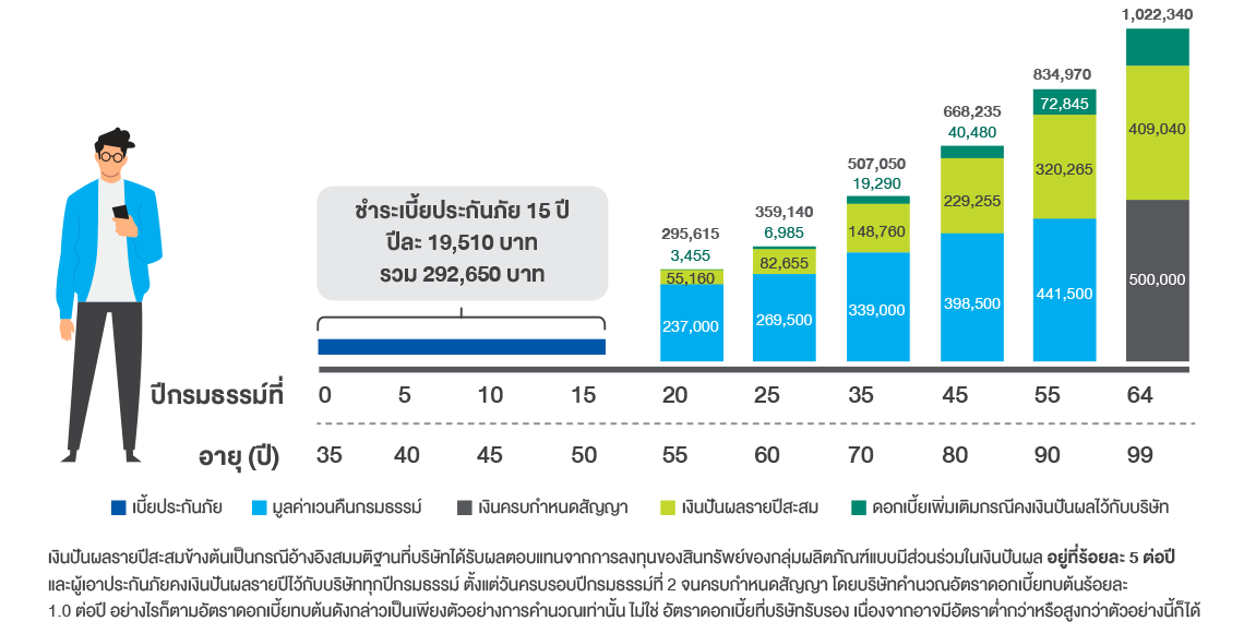 - เงินปันผลรายปี และมูลค่าเวนคืนกรมธรรม์ เป็นมูลค่าที่คำนวณ ณ วันครบรอบปีกรมธรรม์