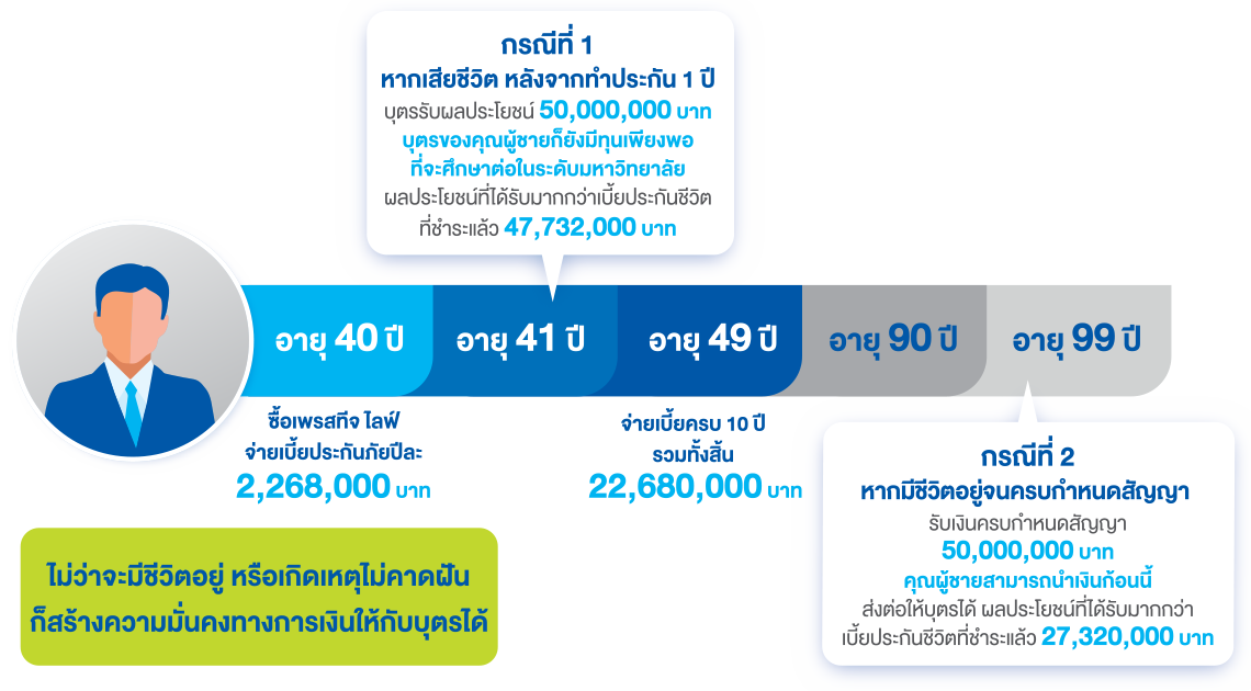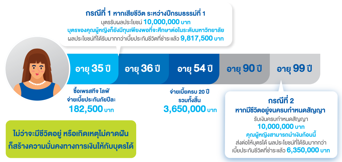 ตัวอย่าง คุณผู้หญิง อายุ 35 ปี สุขภาพสมบูรณ์แข็งแรง อาชีพเจ้าของกิจการ สมัครทำประกัน เพรสทีจ ไลฟ์ ระยะเวลาเอาประกันภัยถึงอายุ 99 ปี ระยะเวลาชำระเบี้ยประกันภัย 20 ปี จำนวนเงินเอาประกันภัย 10,000,000 บาท เพื่อสร้างความมั่นคงทางการเงินให้กับครอบครัว