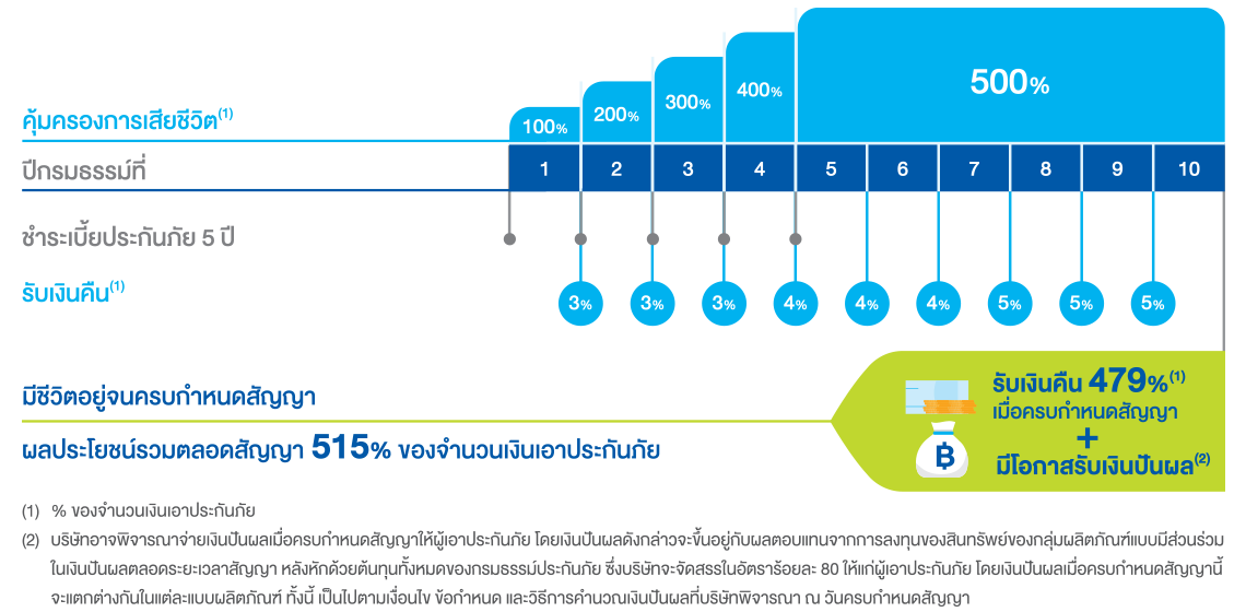 [1] บริษัทอาจพิจารณาจ่ายเงินปันผลเมื่อครบกำหนดสัญญาให้ผู้เอาประกันภัย โดยเงินปันผลดังกล่าวจะขึ้นอยู่กับผลตอบแทนจากการลงทุนของสินทรัพย์ของกลุ่มผลิตภัณฑ์แบบมีส่วนร่วมในเงินปันผลตลอดระยะเวลาสัญญา หลังหักด้วยต้นทุนทั้งหมดของกรมธรรม์ประกันภัย ซึ่งบริษัทจะจัดสรรในอัตราร้อยละ 80 ให้แก่ผู้เอาประกันภัย โดยเงินปันผลเมื่อครบกำหนดสัญญานี้จะแตกต่างกันในแต่ละแบบผลิตภัณฑ์ ทั้งนี้ เป็นไปตามเงื่อนไข ข้อกำหนด และวิธีการคำนวณเงินปันผลที่บริษัทพิจารณา ณ วันครบกำหนดสัญญา