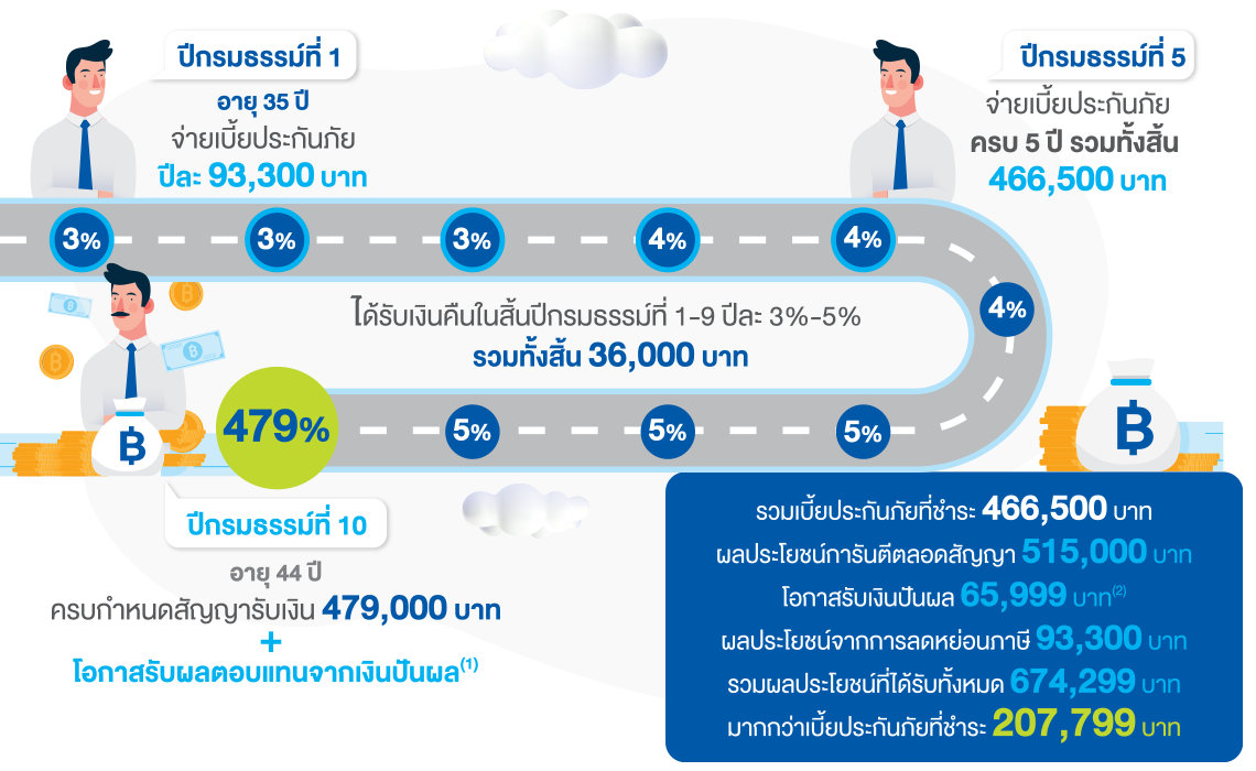 คุณผู้ชาย อายุ 35 ปี สุขภาพสมบูรณ์แข็งแรง สมัครทำประกัน แท็กซ์ เซฟเวอร์ 10/5 (มีเงินปันผล) จำนวนเงินเอาประกันภัย 100,000 บาท เบี้ยประกันภัยรายปี ปีละ 93,300 บาท และมีอัตราภาษีเงินได้บุคคลธรรมดาร้อยละ 20 ตลอดอายุสัญญา