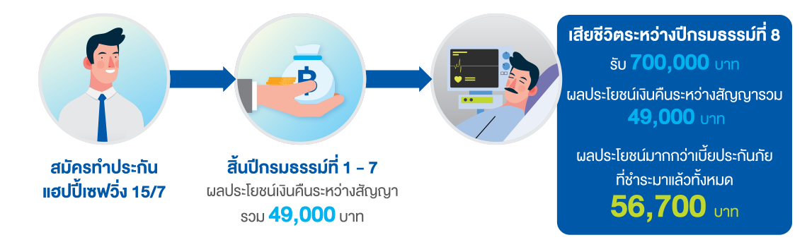 ตัวอย่าง คุณผู้ชายอายุ 35 ปี สุขภาพสมบูรณ์แข็งแรง สมัครทำประกันแฮปปี้เซฟวิ่ง 15/7 ระยะเวลาเอาประกันภัย 15 ปี ระยะเวลาชำระเบี้ยประกันภัย 7 ปี จำนวนเงินเอาประกันภัย 100,000 บาท เบี้ยประกันภัยรายปี ปีละ 98,900 บาท และมีอัตราภาษีเงินได้บุคคลธรรมดาร้อยละ 20 ตลอดอายุสัญญา