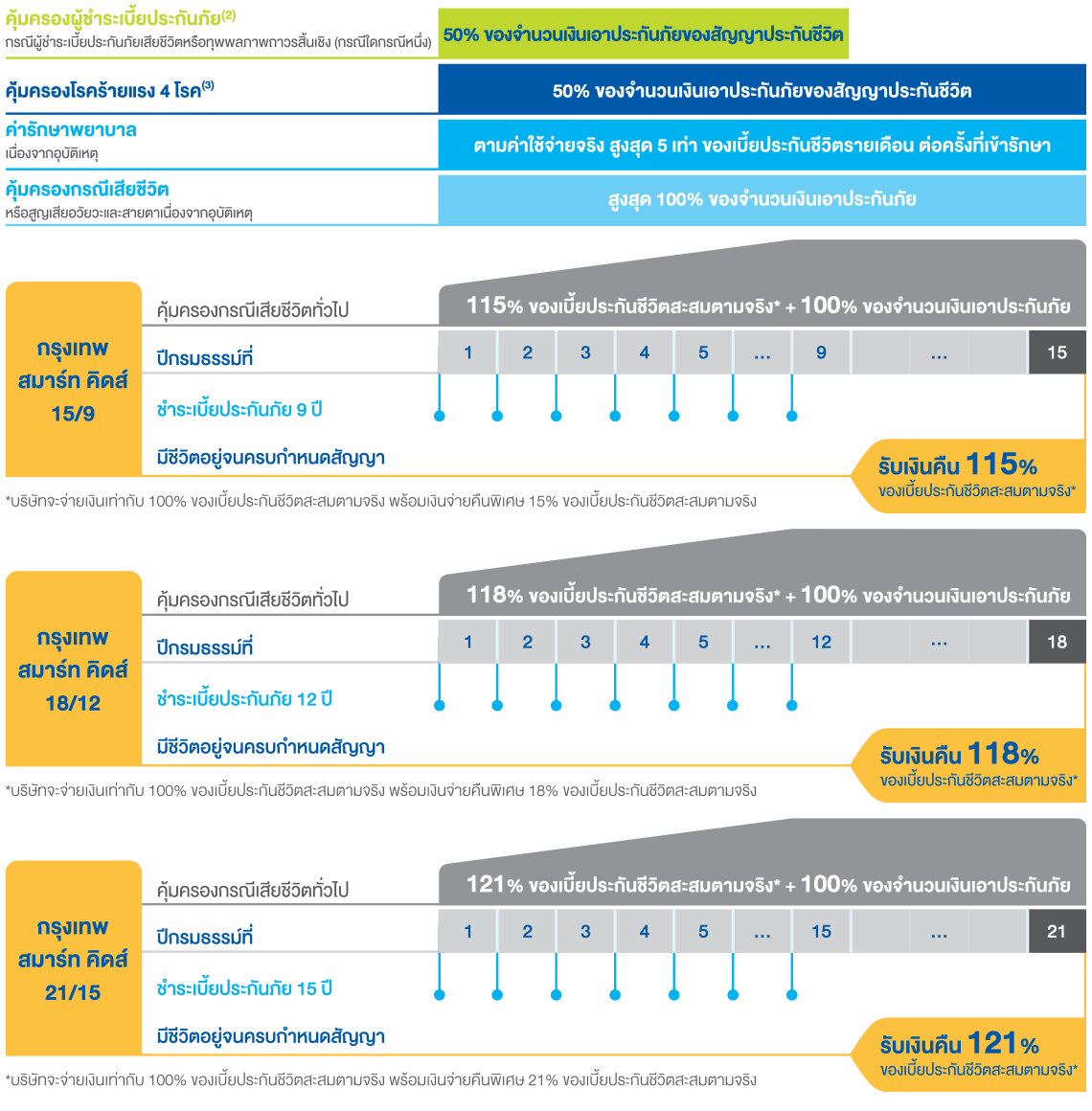 - เบี้ยประกันภัยของแบบประกัน กรุงเทพ สมาร์ท คิดส์ และเบี้ยประกันสุขภาพ (ถ้ามี) สามารถนำไปหักลดหย่อนภาษีเงินได้บุคคลธรรมดาตามหลักเกณฑ์ที่กรมสรรพากรกำหนด